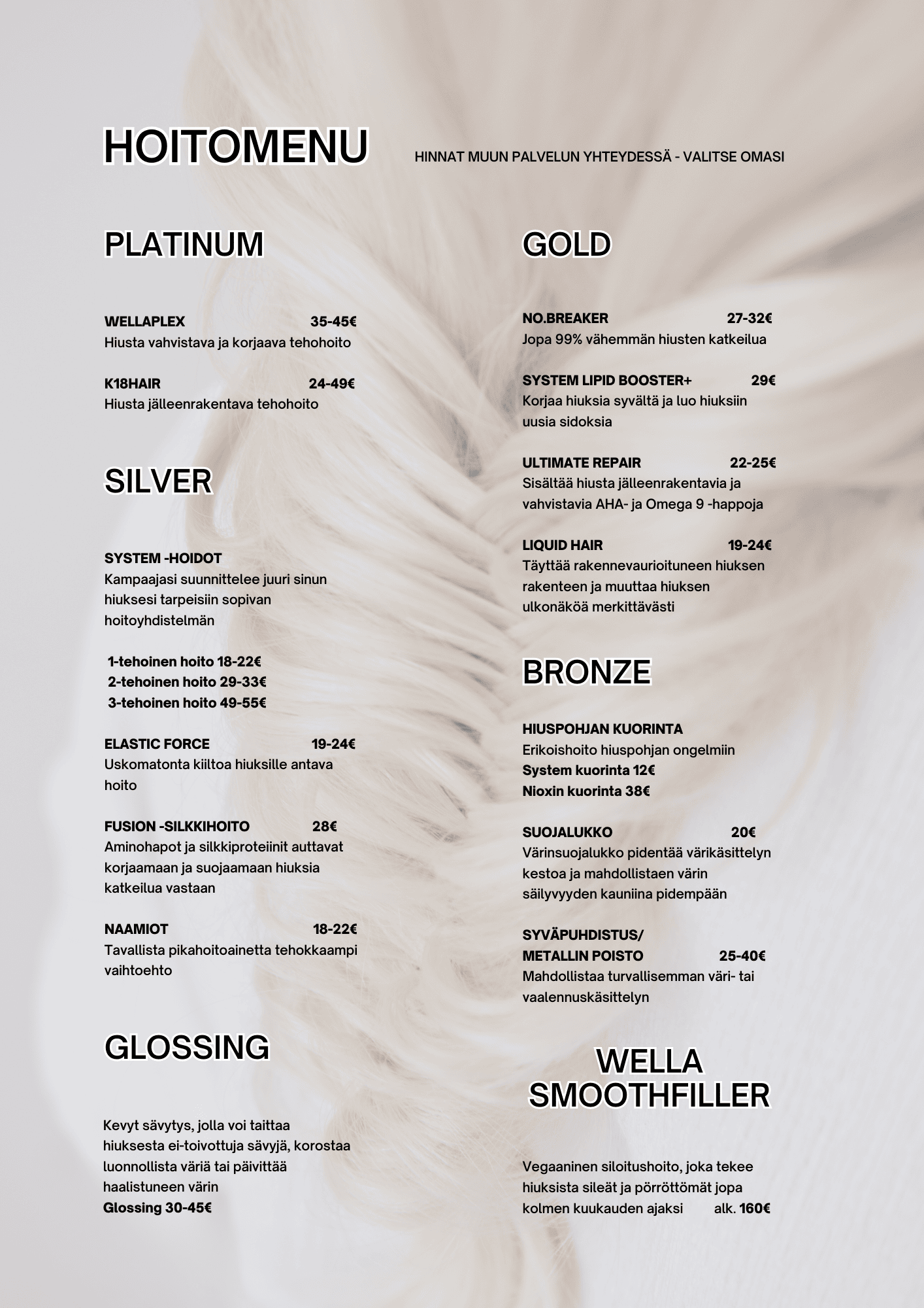 Hinnat sis. alv 25,5 %. Peruuttamattomasta tai alle 48 t. peruutetusta ajasta veloitamme 75% palvelun hinnasta. Sopimuksesta auki pyhäpäivinä. Varaa aika ilmaiseen konsultaatioon tarkemman hinta-arvion määrittämiseksi.
